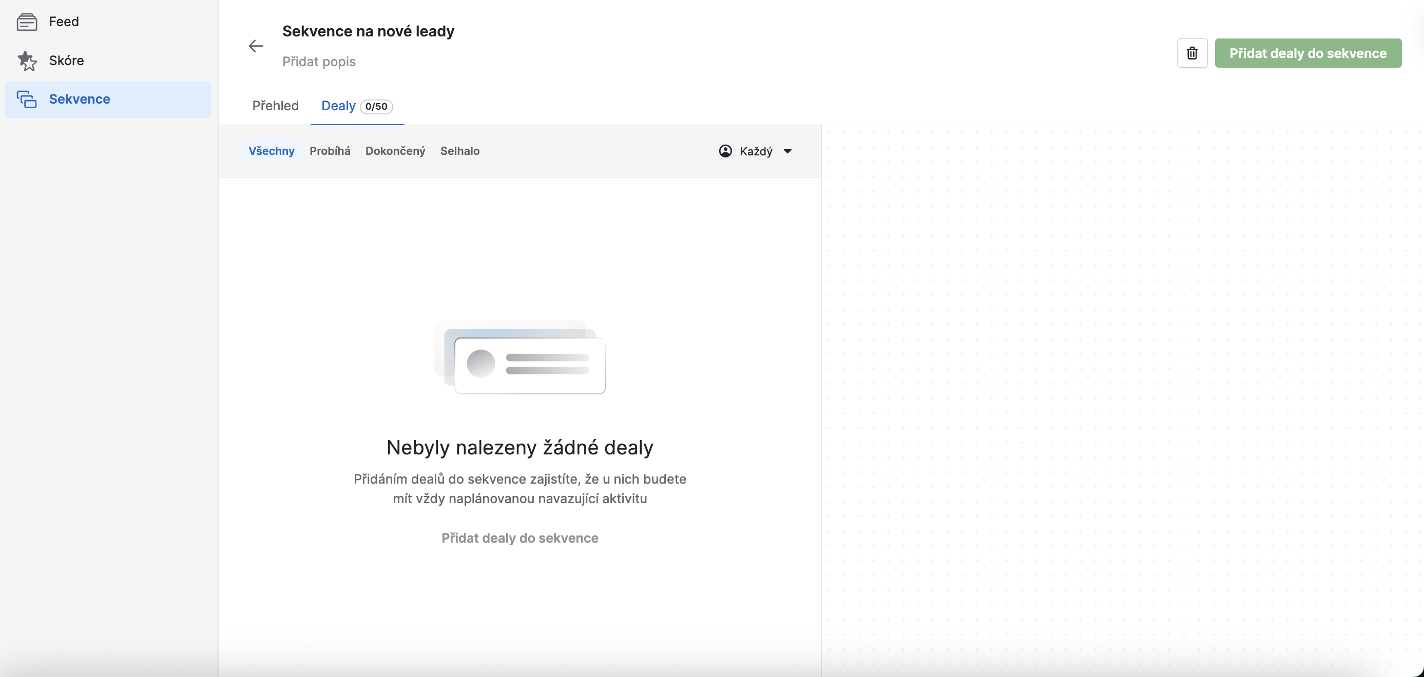 - Přímo v nástroji pro tvorbu sekvencí: klikněte na tlačítko „Přidat dealy do sekvence“ vpravo na obrazovce, zadejte deal, který chcete přidat, a uložte.