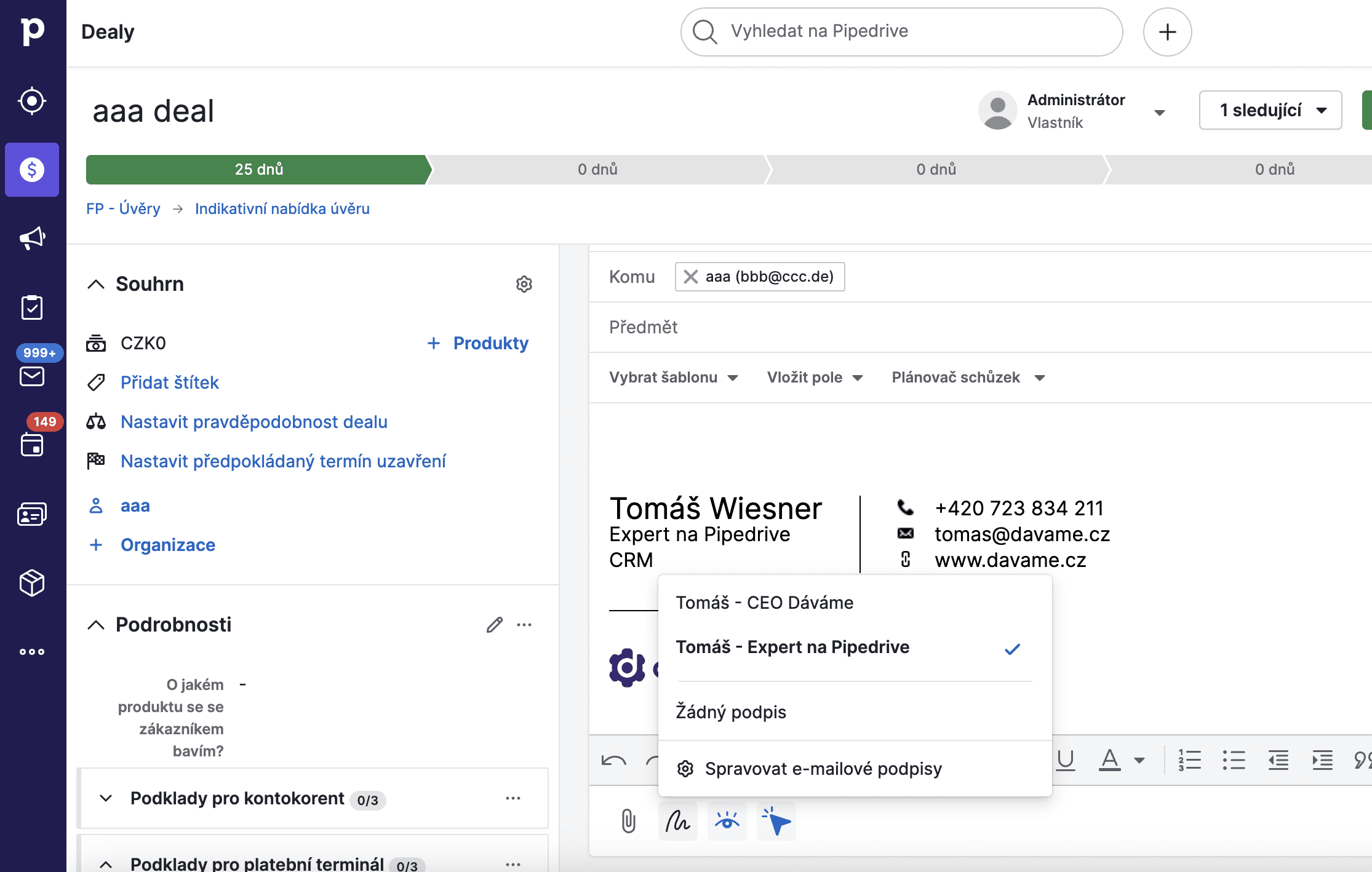 Pokud máte v Pipedrive synchronizován 1 (či více) e-mailů, tak možná oceníte i novou funkci, kdy si můžete vybírat mezi různými podpisy? K čemu je to dobré? Například pokud máte různé skupiny lidí, s kterými komunikujete - například do e-mailu investorů chcete vložit informaci o vaší pozici ředitele/jednatele, zatímco pro vaše zákazníky je důležitější vědět, že jste certifikovaný odborník na vrtání studní.