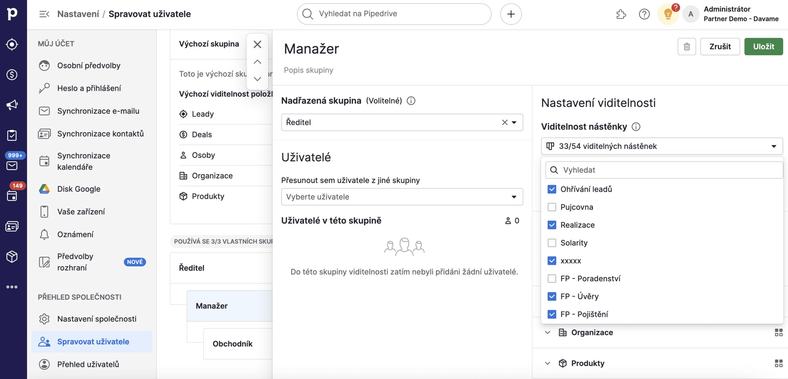 - Viditelnost nástěnek (pipelines) a detailů dealů (vlastních polí) dle nástěnky