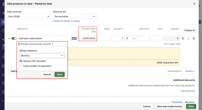 Příklad: Jste například marketingová agentura - se zákazníkem na začátku uzavřete smlouvu na analýzu a nastavení ppc kampaní a měsíční kampaně ve výši 100 tisíc korun. Nově budete moci vše evidovat u jednoho dealu - do produktů přidáte jednorázové položky (analýza, nastavení ppc) a opakovaný produkt - kampaně za 100 tisíc každý měsíc na dalších 12 měsíců.